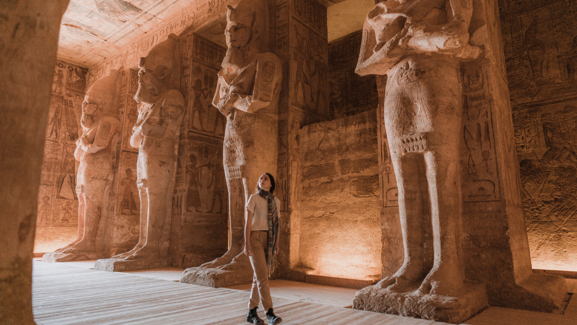 Een reiziger verkent de indrukwekkende beelden in de tempel van Abu Simbel, een van de best bewaarde archeologische schatten van Egypte.