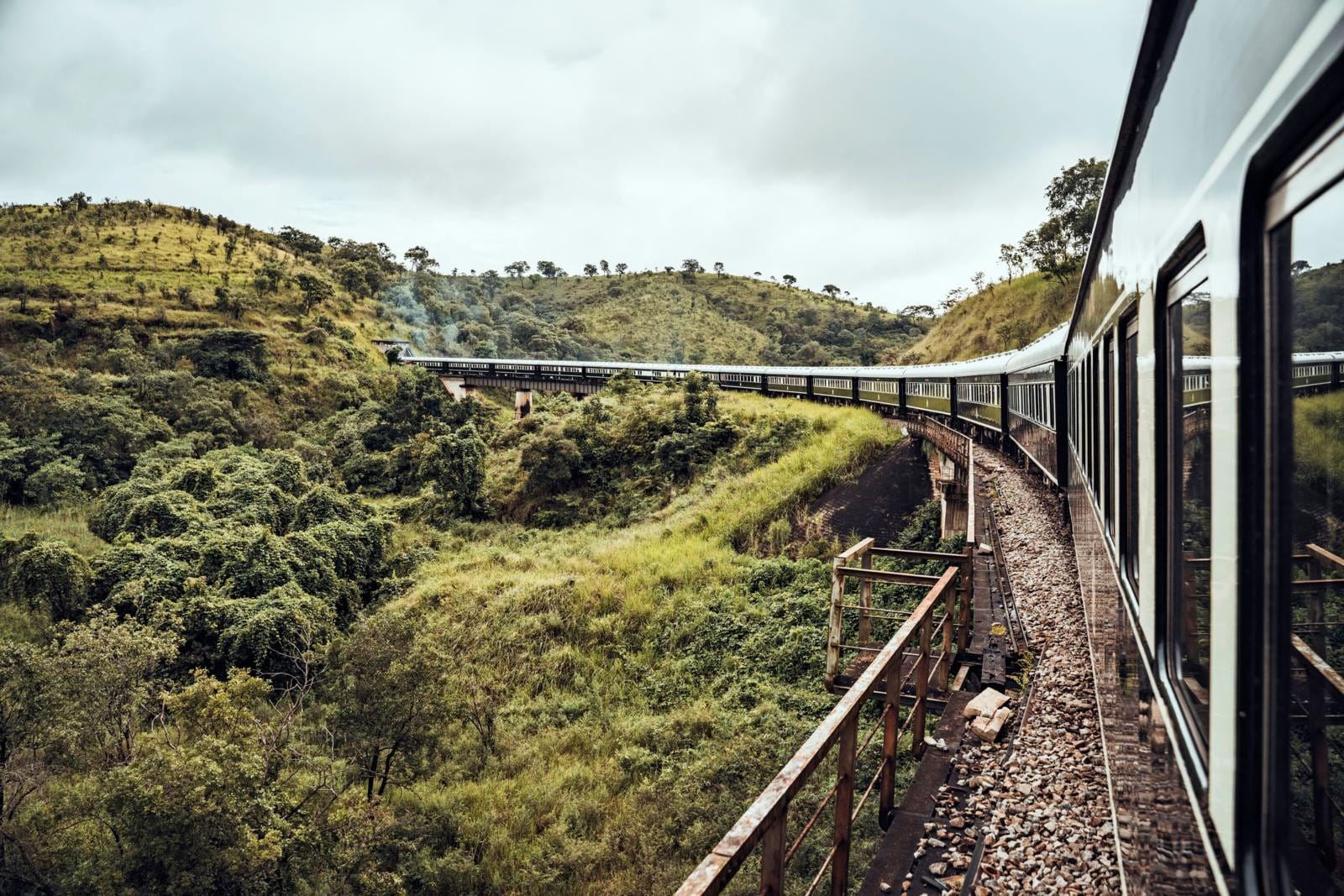 De super-de-luxe Pride of Africa-trein zoekt zijn weg omhoog naar de zuidelijke hoogvlakte van Tanzania.