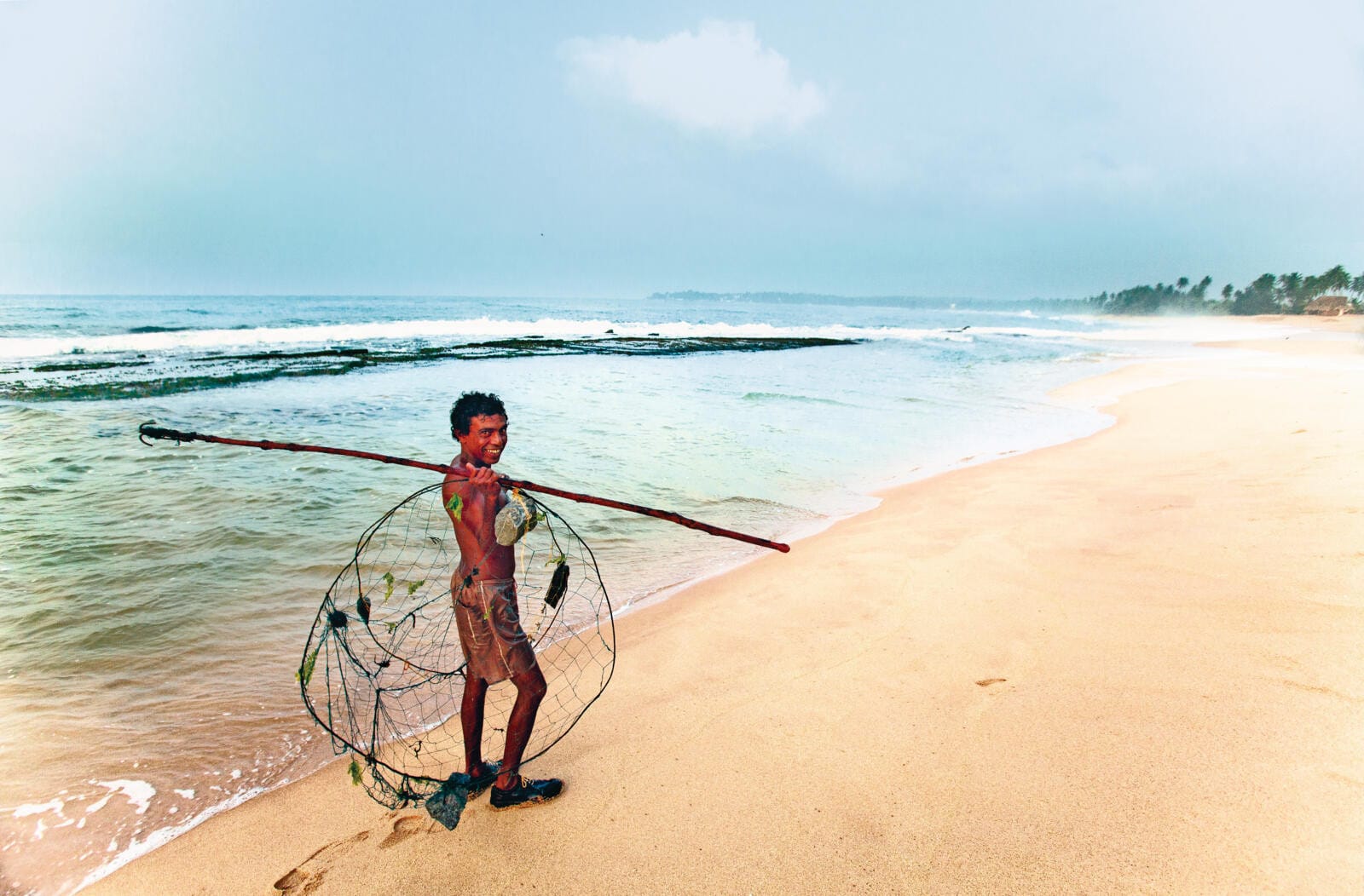 In Sri Lanka zijn nog volop vissers oude stijl. Zoals de man op de foto, in de omgeving van Tangalla,