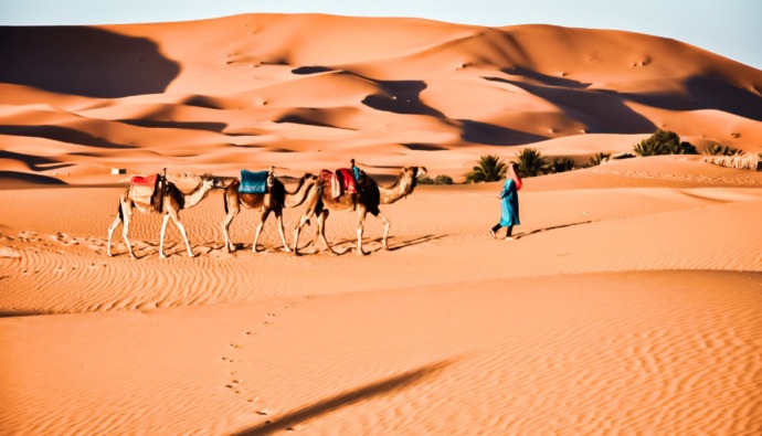Marokko kent nog altijd een sterke nomadische cultuur die je buiten de grote steden overal terugziet. Reis af naar Erg Chebbi bij Merzouga om daar in een tentenkamp midden in de Saharawoestijn te verblijven en je onder te dompelen in de Berberse cultuur. Maak een tochtje op dromedarissen, ga crossen op een quad of surf van de duinen af. In de avond eet je door de nomaden bereide tajine, waarna je met z’n allen gaat dansen en muziekspelen bij een kampvuur. Vergeet ook niet om sterren te kijken, want lichtvervuiling kennen ze hier niet. Sta de volgende ochtend zo vroeg mogelijk op, want de opkomende zon is hier adembenemend mooi.