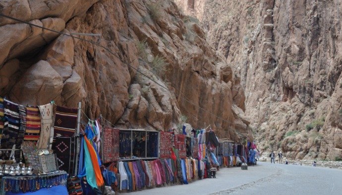 Als je in de buurt bent van Tinghir kun je de Todra Gorge bijna niet missen. Deze weg loopt tussen twee gigantische rotsen in en wordt vaak de Grand Canyon van Marokko genoemd. Dat is niet eens zo’n vreemde vergelijking, gezien de gelijkenissen tussen het gesteente en de ruige kliffen. De geul tussen de rotsen is ook een knooppunt voor nomaden die op doorreis zijn en hun spullen kopen en verkopen op marktjes langs de weg. Een stukje westwaarts vind je de Dadèsvallei, een bergachtig landschap met ontelbaar veel kasba’s en een prachtige natuur.