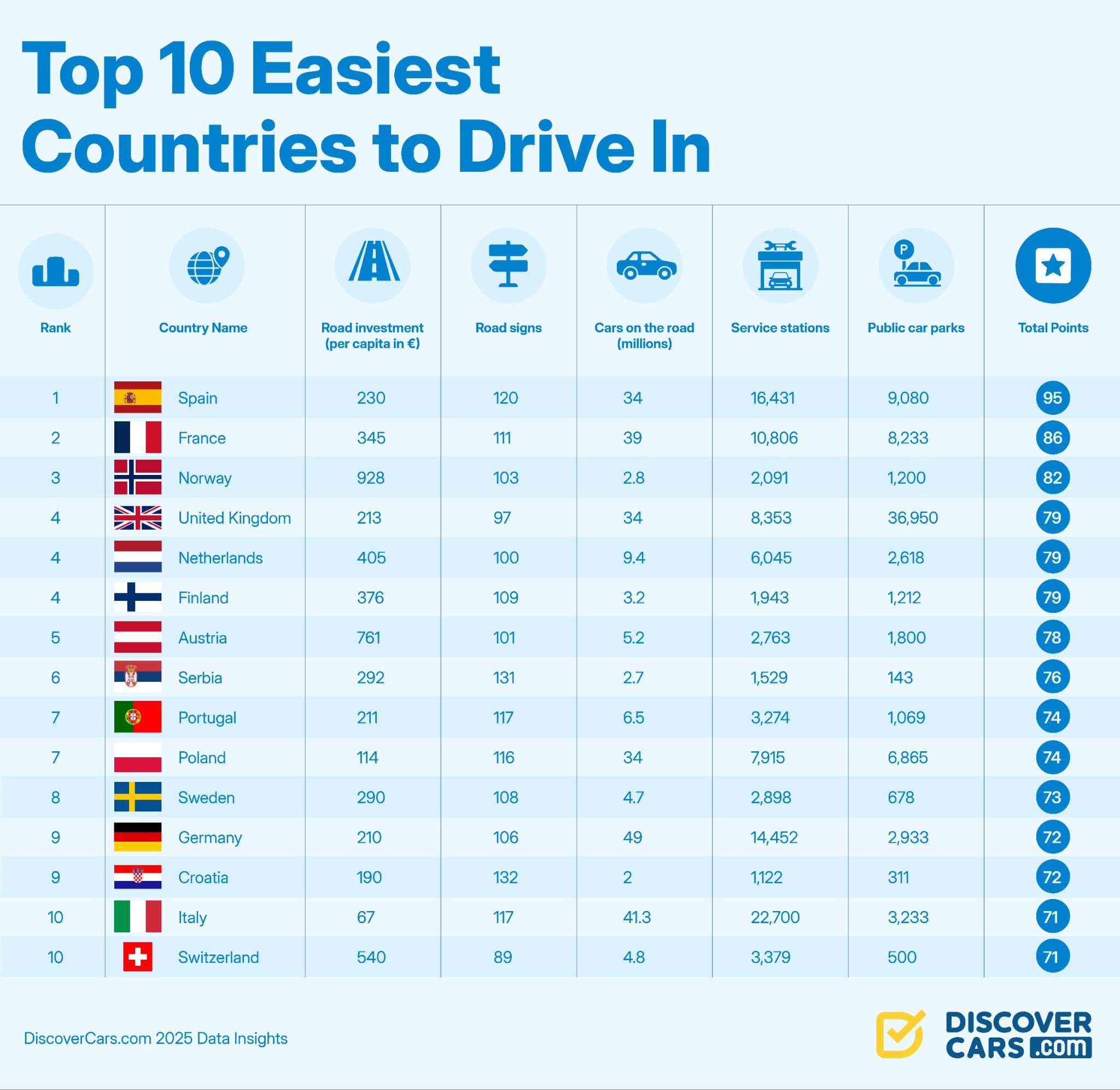 Voor de ranglijst werd gekeken naar vijf belangrijke factoren die samen bepalen hoe makkelijk autorijden in een land is: hoeveel gemiddeld per inwoner wordt geïnvesteerd in het onderhoud van de weg, de hoeveelheid verschillende verkeersborden die duidelijkheid bieden bij navigatie, het aantal geregistreerde auto’s (hoe minder, hoe rustiger op de weg), het aantal tankstations en het aantal openbare parkeerplaatsen. Per onderdeel konden landen maximaal 26 punten scoren, met een totaal van 130. Alleen landen met voldoende betrouwbare data zijn meegenomen. Het resultaat: een verrassende mix van Zuid-Europese roadtripklassiekers en Noord-Europese rustpunten, met Nederland in de absolute top. We tellen af van tien naar één!
