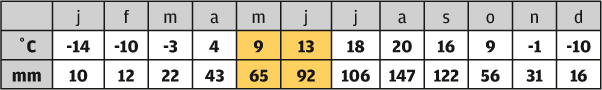 De gemiddelde temperatuur en neerslag in Noord-Rusland: