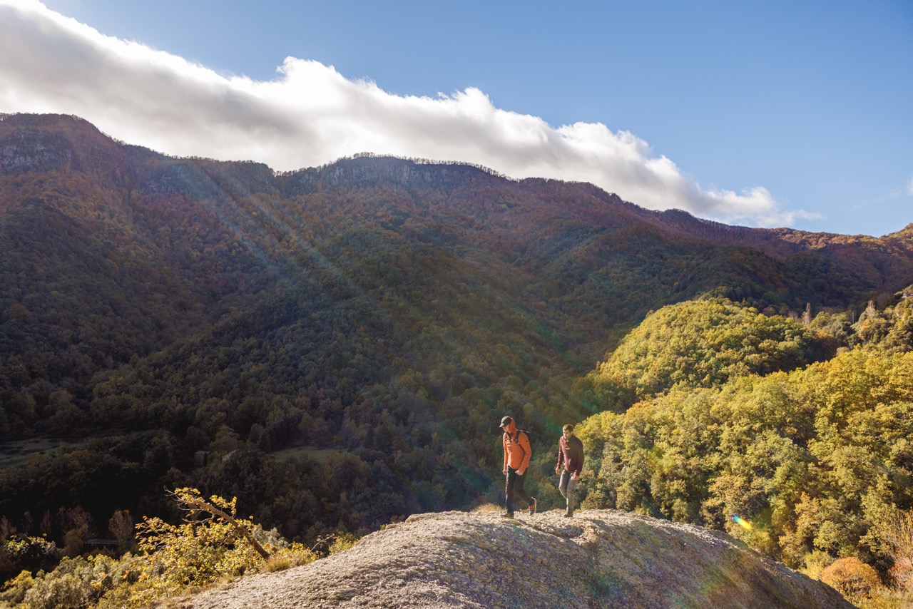Twee wandelaars kijken uit over de groene en kleurrijke berghellingen van de Pyreneeën van Girona in Spanje