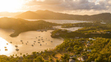 Luchtfoto van een zonsondergang over de baai Shirley Heights van Antigua, met zeilboten en weelderig groen
