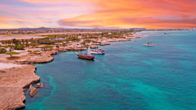 Luchtfoto van een kleurrijke zonsondergang boven de kust van Aruba met zeilschepen op turquoise water