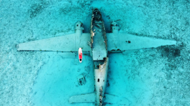 Luchtfoto van het vliegtuigwrak dat crashte bij Norman's Cay in 1980, in het kristalheldere water van de Bahama’s, met een kajakker die het wrak verkent.
