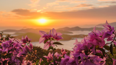 Kleurrijke bloemen bij zonsondergang op de Amerikaanse Maagdeneilanden, met uitzicht over de oceaan en eilanden in de verte.