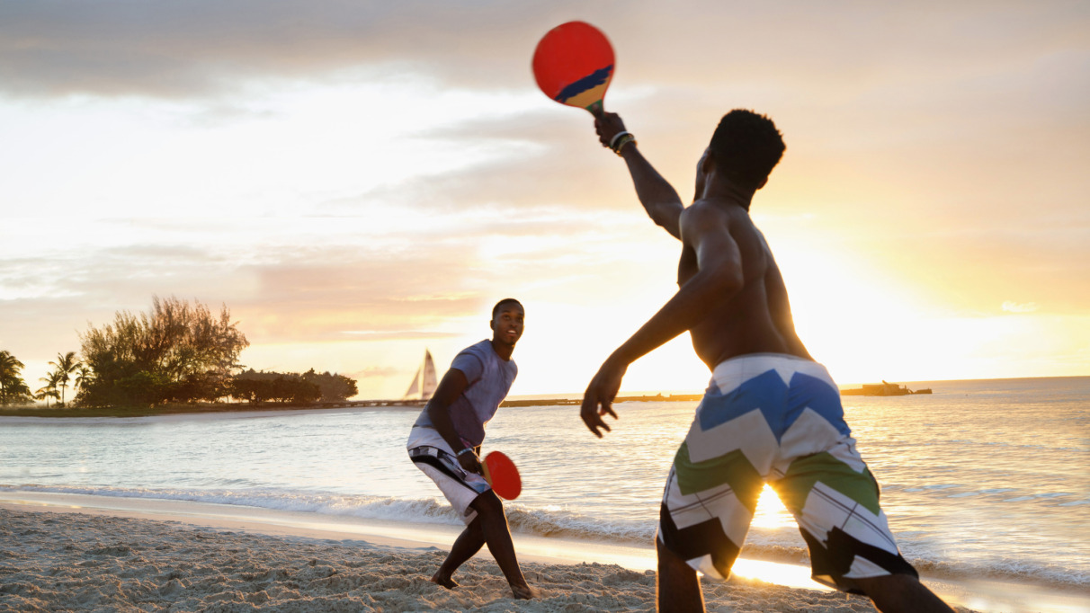 Twee mannen spelen strandtennis bij zonsondergang op een tropisch strand in Barbados