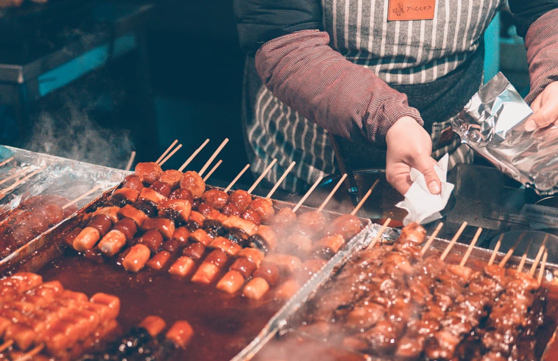 Street food in de Myeondong-buurt van Seoul, Zuid-Korea (Foto: Ian Valerio (modified), Unsplash)