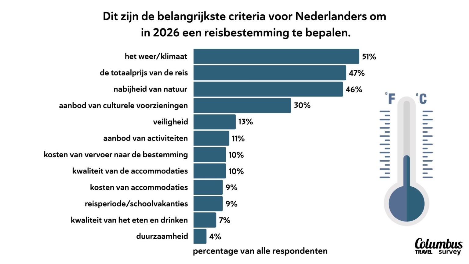 Duurzaamheid wordt breed onderschreven als waarde, maar speelt bij het daadwerkelijk kiezen van een bestemming zelden de hoofdrol. Slechts een klein deel noemt duurzaamheid expliciet als doorslaggevend criterium.