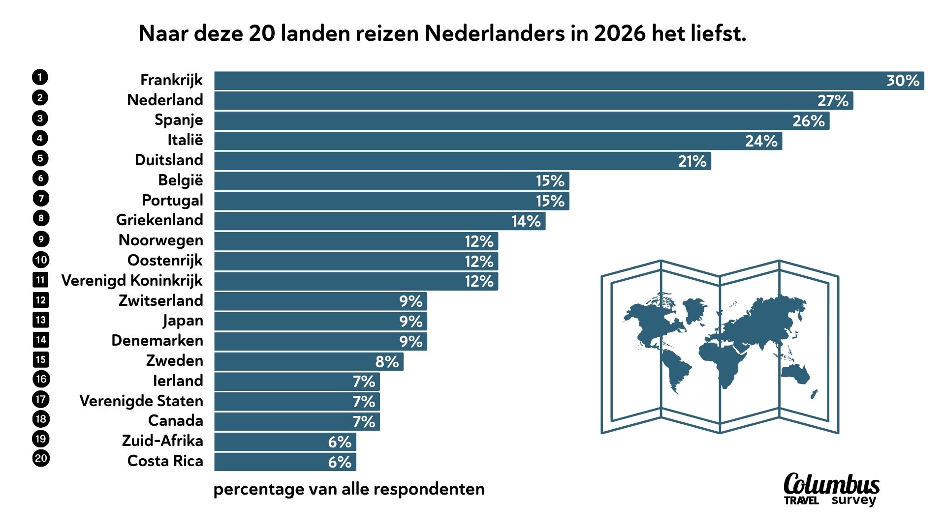 Tegelijkertijd zien we dat verre reizen niet verdwijnen, maar selectiever worden. Japan (9%), de Verenigde Staten (7%), Canada (7%), Zuid-Afrika (6%) en Costa Rica (6%) staan nog altijd stevig in de top twintig. Het zijn geen ‘even tussendoor’-bestemmingen, maar reizen met een duidelijke belofte: natuur, cultuur of een once-in-a-lifetime-ervaring.