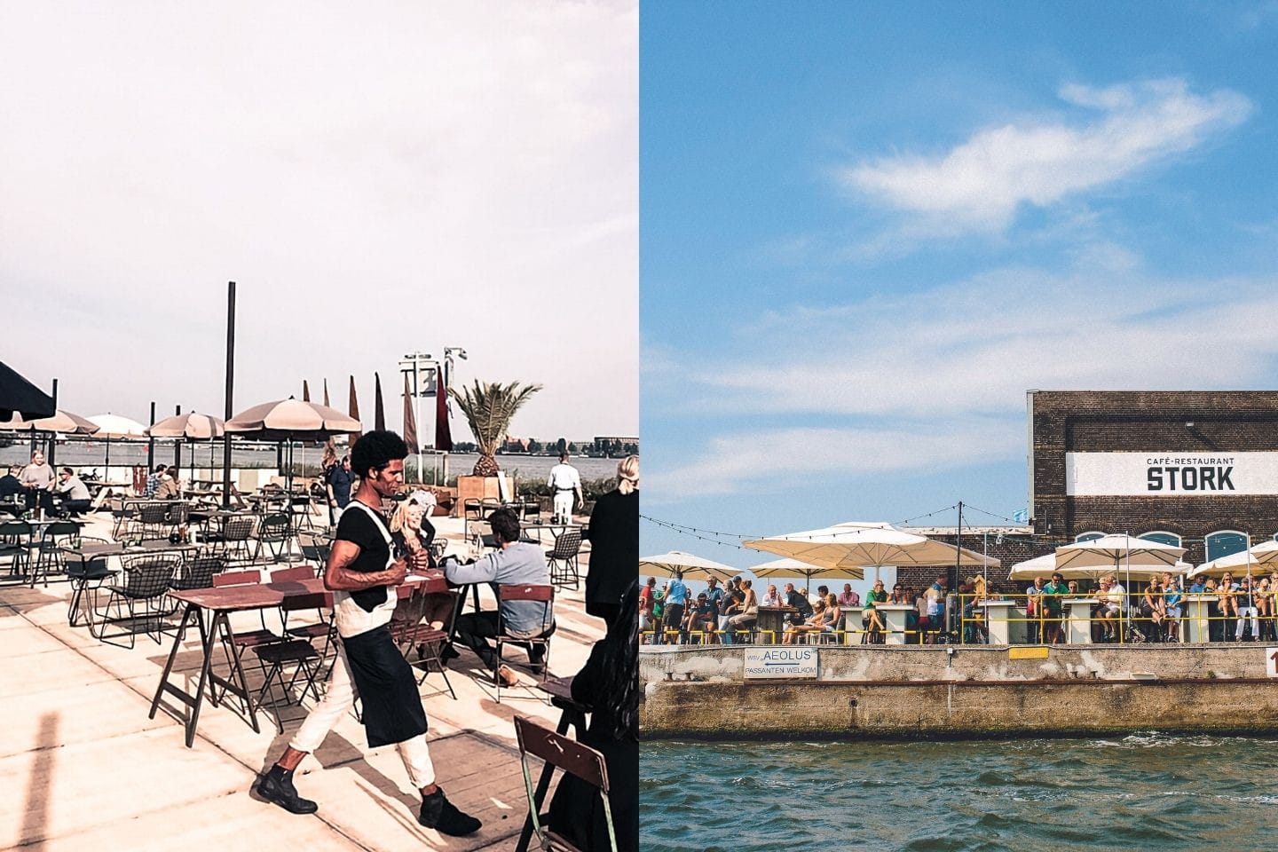 Links: het terras van Hangar. Rechts: het terras van Stork.