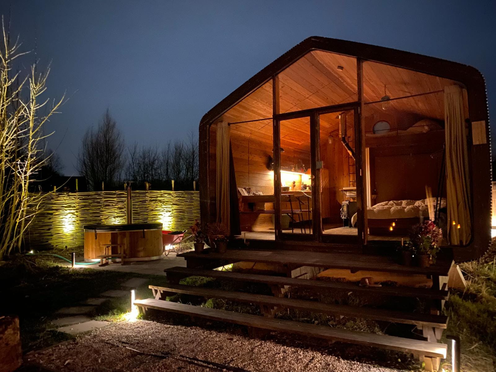 Niet alleen wollige varkentjes, kakelende kippen en nieuwsgierige geiten hebben het naar hun zin in de ecologische woonwijk Almere Oosterwold; ook jij voelt je kiplekker in deze wellnesscabin in Flevoland, duurzaam gebouwd van hout en karton. In de tuin, met uitzicht op het bos, tref je een hottub, een sauna op zonnepanelen en een pizzaoven. Vanaf € 141 per nacht voor twee personen.