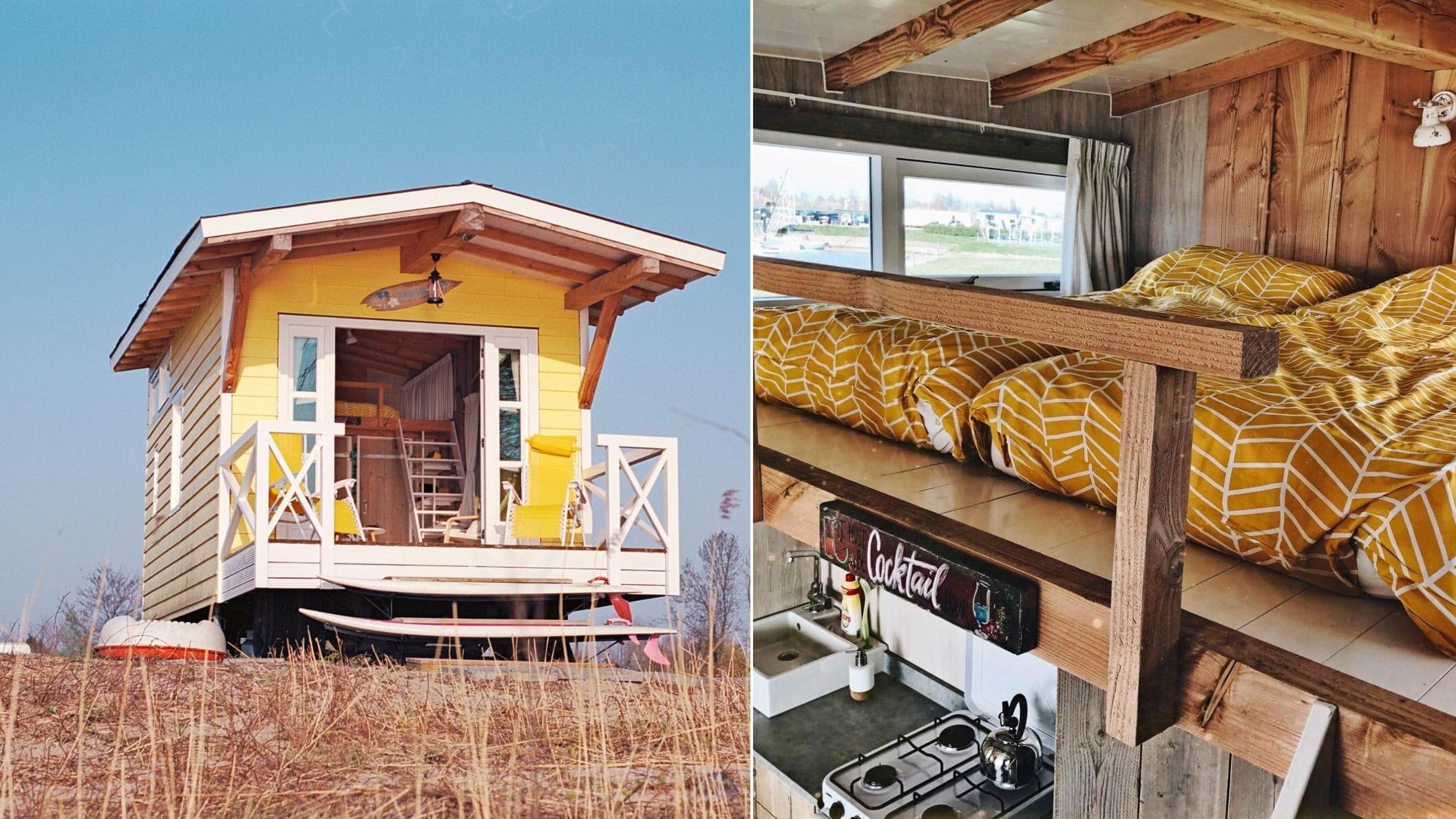 Zuid-Holland is geen Zuid-Frankrijk en de deining van de Lek haalt het niet bij de golven aan de Atlantische kust, maar zittend in de hangstoel op de veranda van deze surfhut heb je alle reden om het zonnig in te zien. Dit tiny house op Stadscamping Schoonhoven biedt plaats aan een gezin van vier, met het vestingstadje Schoonhoven op loopagstand en het rivierstrand pal voor de deur. € 275 voor twee nachten met maximaal 4 personen.