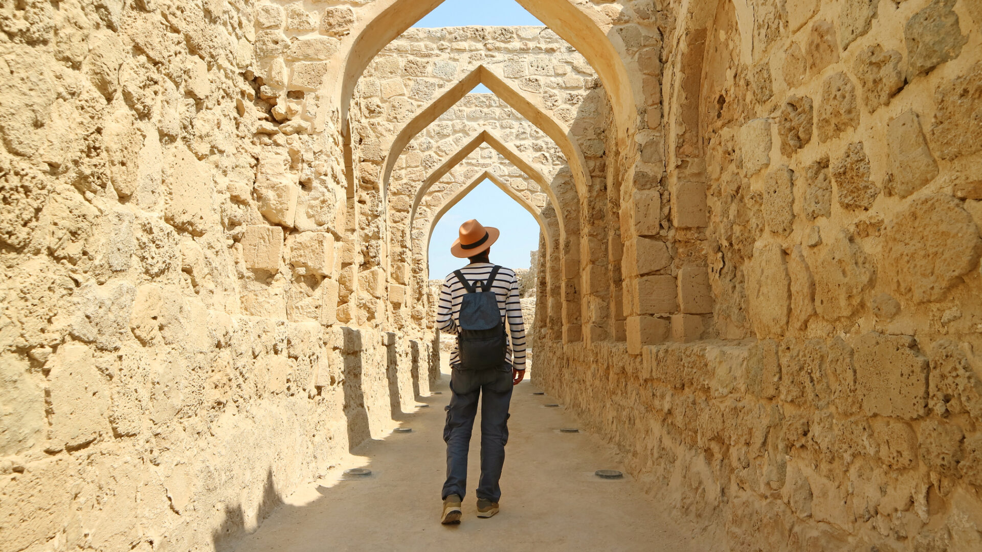 Een reiziger loopt door Bahrain Fort, Manama, Bahrain
