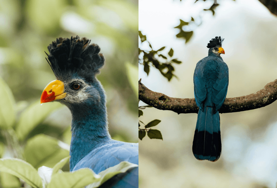Een zeldzame Great Blue Turaco houdt ons goed in de gaten in het Lake Nkuruba Nature Reserve.