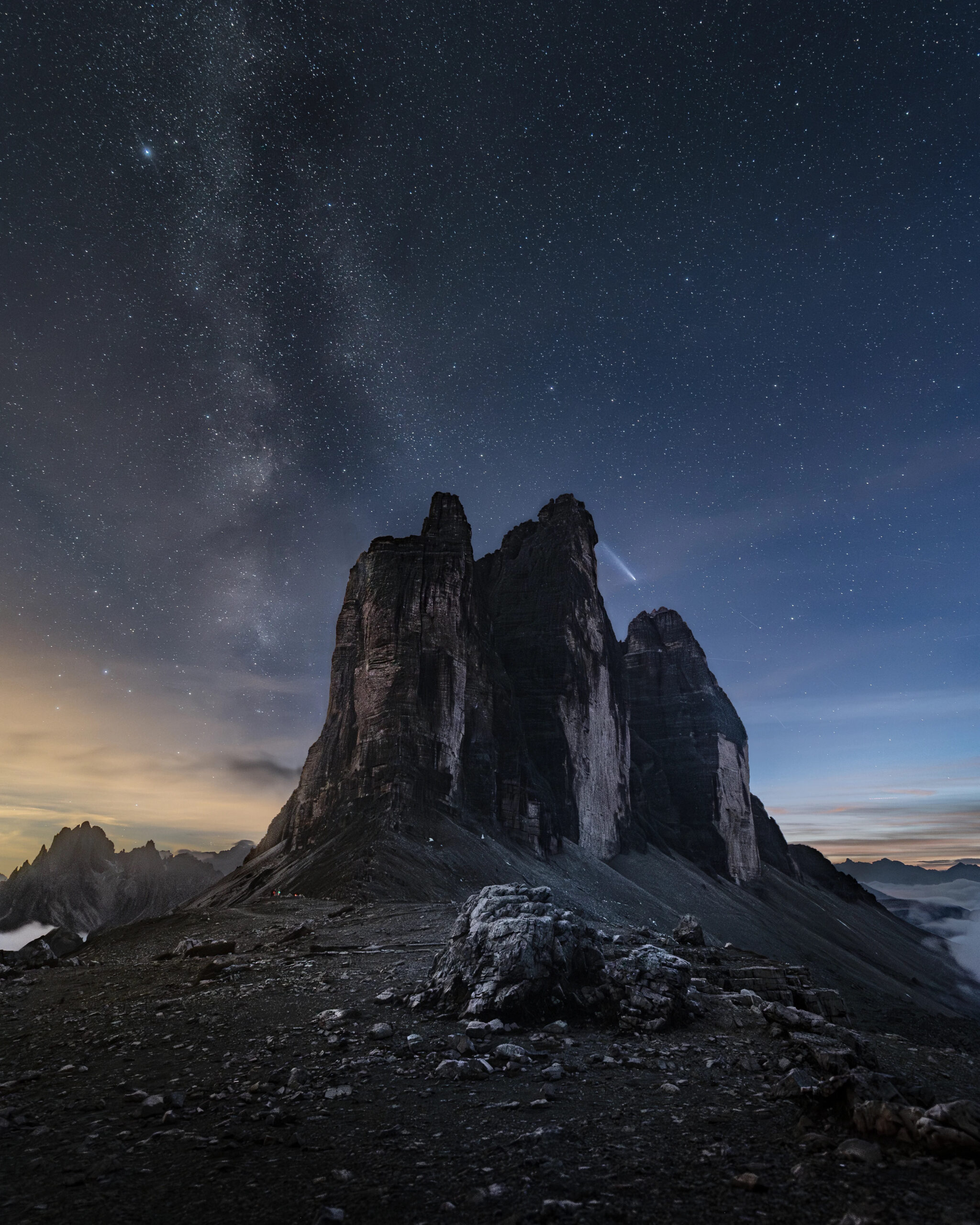 Victor vertelt: 'De iconische Tre Cime in de Dolomieten samen met de Melkweg en de C/2023 A3-komeet.' Volg Victor op Instagram.