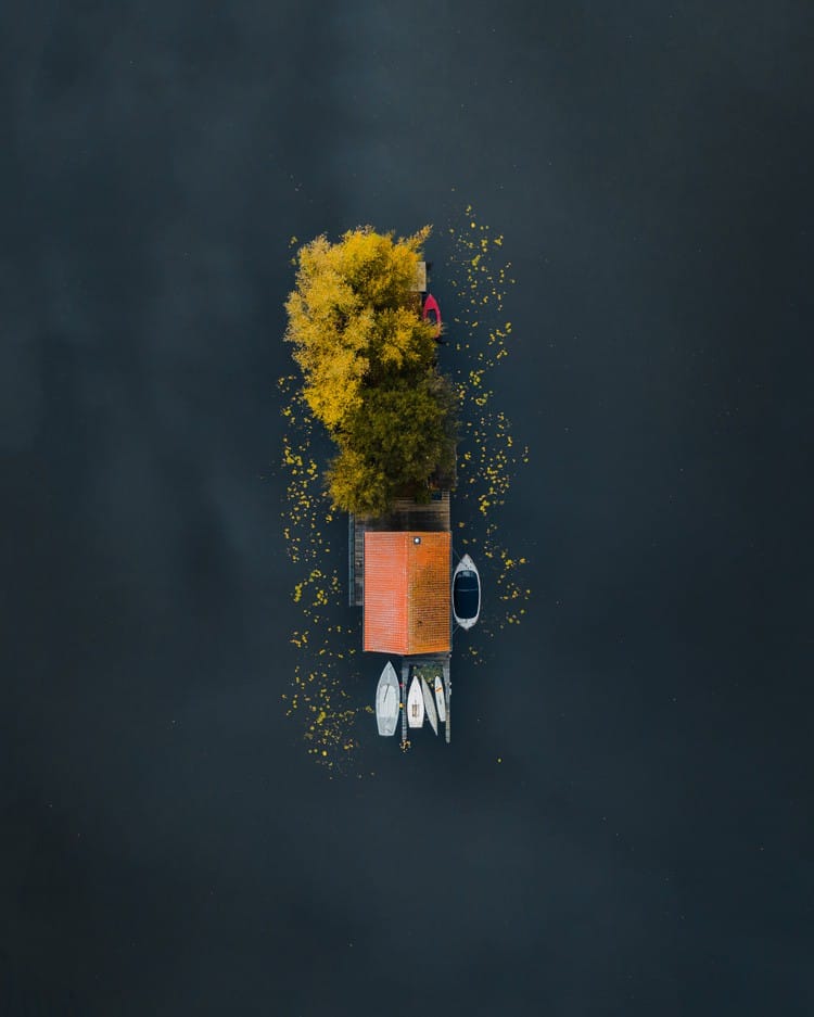 Communitylid Cunodebruin : 'Ook in eigen land heb je verrassende plekken om er even tussenuit te zijn. Dit is Scheendijk bij het plaatsje Breukelen. Je kan bij deze huisjes alleen per boot komen (of met de drone uiteraard). Een paar weken geleden was het eindelijk zover. Ik woon zelf in Utrecht en ben verschillende keren heen en weer gereden om te kijken of er al bladeren rondom het huisje lagen. Dit was eindelijk het geval en ik kon de gedroomde foto maken die ik al een tijd wilde maken!'