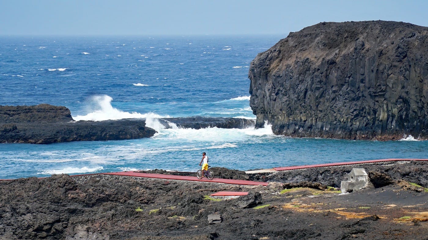 Communitylid Corrie de Winter: 'Fogo, het vulkaaneiland is bijna rond. Een tour langs de kust is ongeveer 80 km, gemakkelijk te doen met een minibusje. Op de fiets is het wat zwaarder trappen, ik heb dan ook weinig fietsers gezien. Behalve dan deze jongen op de fiets bij Ponta do Salina. De rode plankieren dienen als wandelpad en brug. Je hebt vanaf hier een prachtig zicht op grotten, de woeste zee en de rotsen van lava, die hier in zee is gelopen. Je kunt geweldig zwemmen in de natuurlijke bassins rechts. Let wel op de stroming, het is even werken om terug naar het strand te komen. Ook waait het er behoorlijk!'