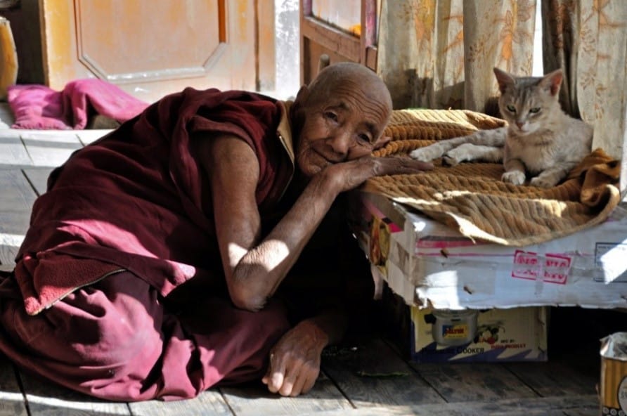 We bezochten het afgelegen nonnenkloostertje van Hemis Shukpachan. Er woonden (in 2011) vijf nonnen, in de leeftijd van 23 tot 82 jaar. We werden hartelijk ontvangen in het zeer eenvoudige – zeg maar armoedige – piepkleine klooster, met thee en zelfgebakken koekjes. Ik mocht één van de nonnen, Lotus Zangmo, interviewen. Zij was toen 72 jaar en verbleef al 50 jaar in het klooster. Haar levensdoel is bidden voor anderen, opdat mensen het in het huidige leven en daarna beter krijgen. De nonnen leven van hun zelf bewerkte stukje land, van giften uit de omgeving en van het weinige dat ze verdienen met het begeleiden van ceremonies bij families in het dorp. Vooral het contact met Lotus en met de oudste non, die het fascinerend vond om voor ons te poseren, zal ik nooit vergeten.’