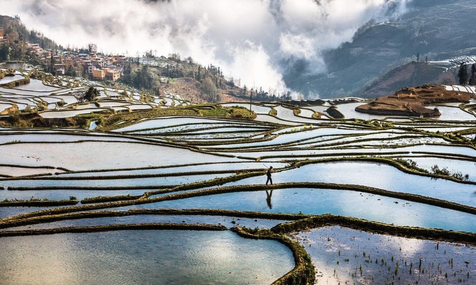 ‘Als iemand mij vraagt waaraan ik de beste reisherinneringen heb, is het antwoord vaak China. In februari 2017 heb ik samen met mijn man een rondreis gemaakt door de provincie Yunnan, in het zuiden van China. Die beroemde rijstterrassen, die wilde ik zeker één keer in mijn leven gezien hebben. In februari en maart staan deze terrassen onder water, waardoor de luchten op een spectaculaire manier in het water weerspiegeld worden. Afhankelijk van zon, mist, tijdstip en je standpunt kleuren de rijstterrassen verschillende op.