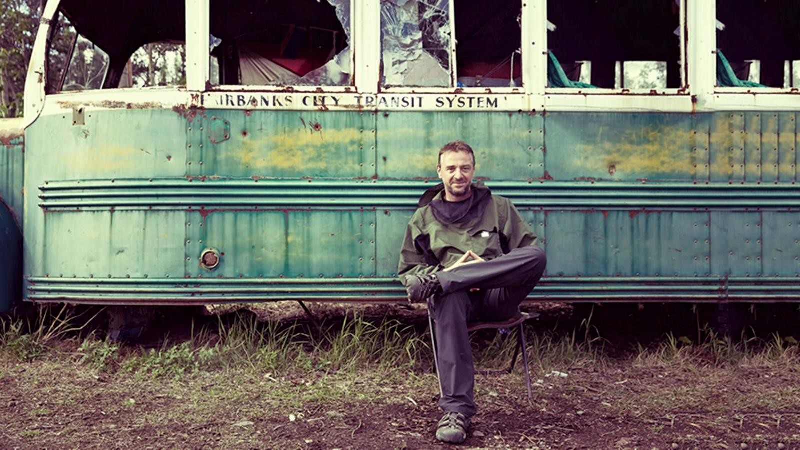 Tom Waes voor de Fairbanks-bus in Alaska, bekend van het boek en de gelijknamige film ‘Into the Wild’. Foto: Een.