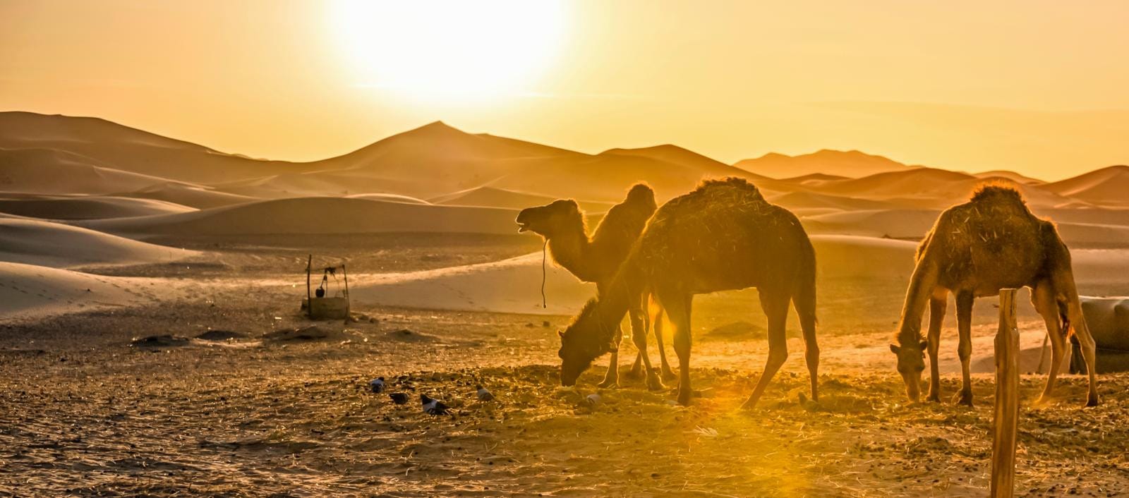Een groep dromedarissen in de Marokkaanse Erg Chebbi. Foto: Anita Grotewal
