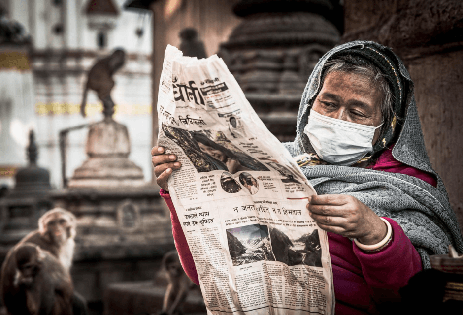 Communitylid Marco Rutten: 'Swayambhunath is een oud religieus complex boven op een heuvel in de Kathmandu-vallei, ten westen van de gelijknamige hoofdstad van Nepal. Dit complex staat ook wel bekend als Monkey Temple, omdat er een groot aantal (heilige) apen rondhangt. Voor Indiase en Nepalese boeddhisten is dit de heiligste plek van het land, en voor Tibetaanse boeddhisten de een-na-heiligste plek, na Bouddhanath. Wij waren er op een zondag, tegelijk met een enkele toerist en tal van locals, die het complex veelal bezoeken in het kader van een weekenduitje. Deze dame hield de verkoop van souvenirs even voor gezien en sloeg een krant open die ongetwijfeld vol staat met coronaperikelen.'