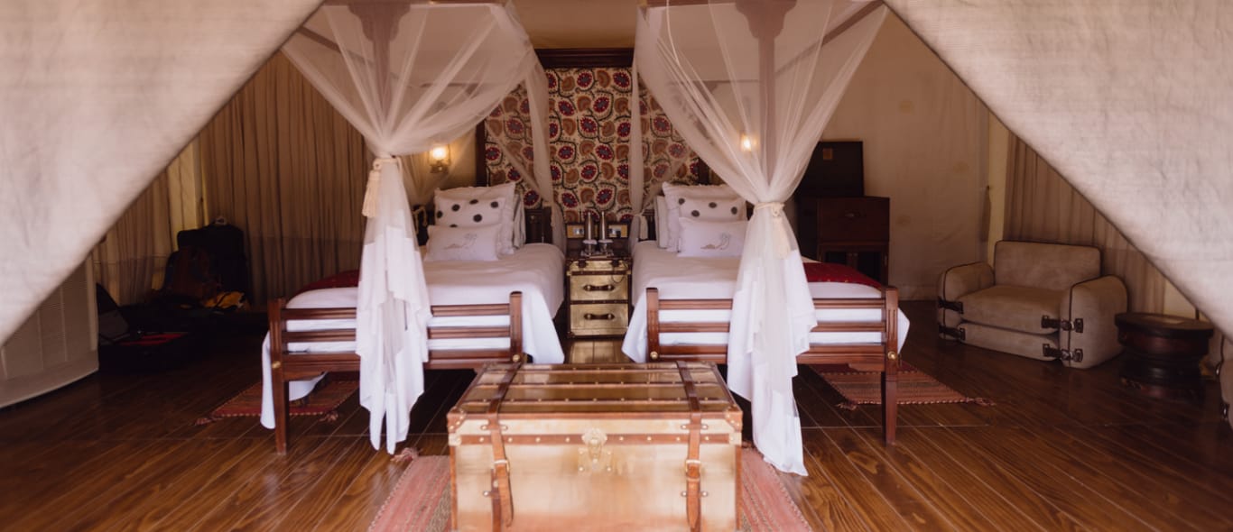 Tijdens onze reis door Ladakh, bezochten we twee campsites die worden gerund door The Ultimate Traveling Camp. Hun canvastenten zijn geproduceerd in Kenia. Chamba Camp Thikse telt twintig tenten en ligt op een prachtige locatie aan de voet van het Thikseklooster. Een aantal van de tenten heeft een terrasdek met uitzicht op het klooster. Chamba Camp Diskit ligt in een van de meest dramatische en surrealistische landschappen ter wereld: de Nubravallei. Het kamp wordt verlicht door middel van zonne-energie. Op het terrasdek aan het water geniet je van misschien wel de beste boterkip van India. Vanaf € 775 (Thikse) en € 825 (Diskit) per nacht voor twee personen (incl. maaltijden, excursies en transfers).