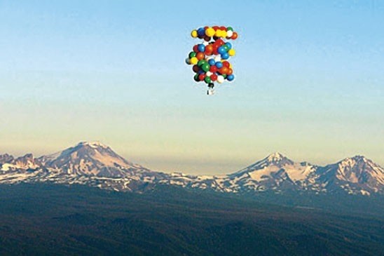 Vorige week vloog een 47-jarige man over Oregon met slechts een tuinstoel en honderdenvijf grote heliumballonnen. Zijn familie, vrienden en hond volgden hem vanaf de grond, in een caravan.