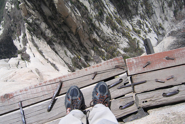 Ladders, kettingen, smalle balken … dat vat de Chinese Huashan wel samen. Niet echt geruststellend, maar het uitzicht aan de top maakt het allemaal de moeite waard.