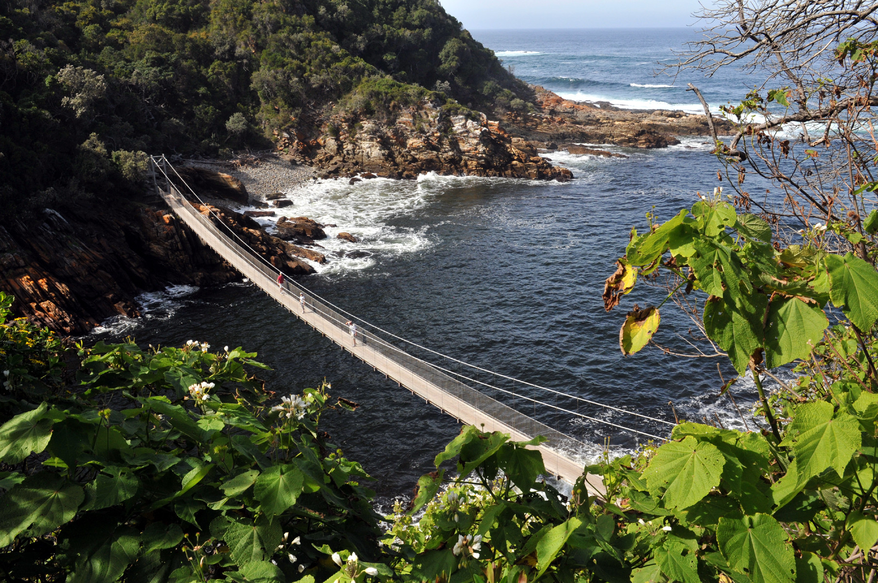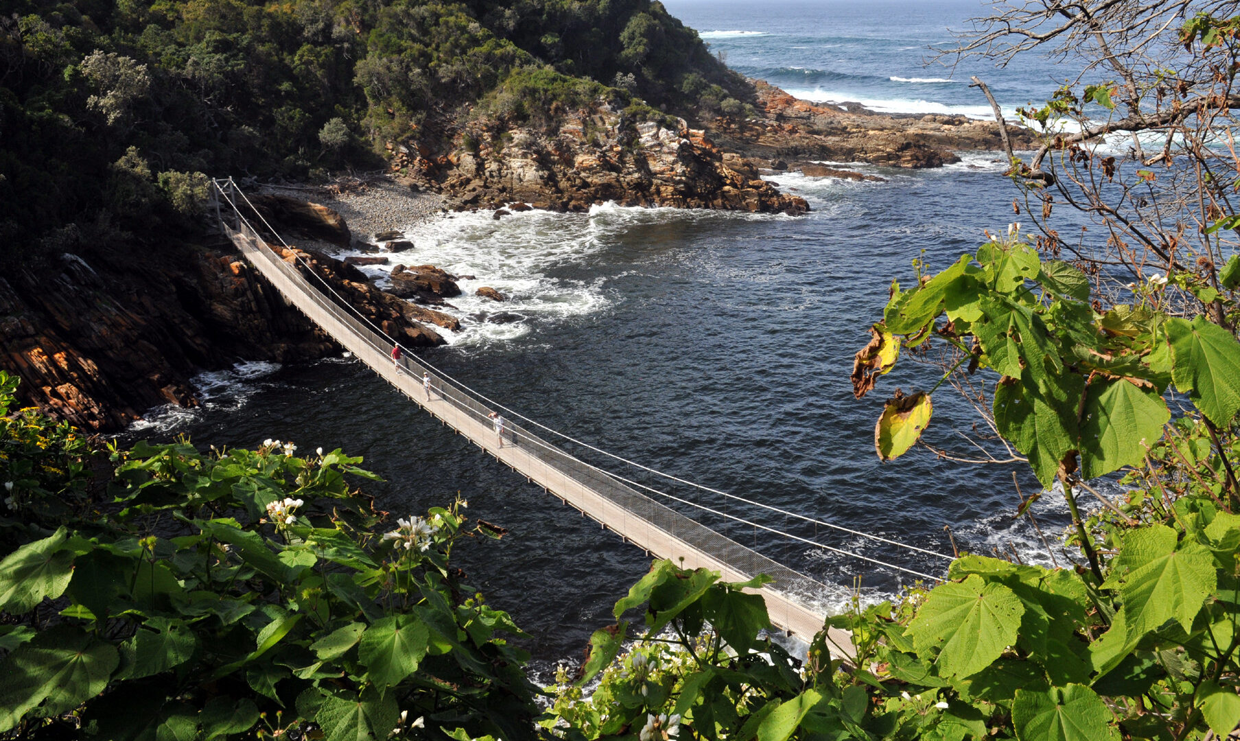 Je kunt de Otter Trail ook volgen tot aan de waterval, waar je een frisse duik neemt om vervolgens weer terug te lopen naar Storms River Mouth. Dan ben je heen en terug slechts circa drie uur kwijt. Ga het park binnen bij Storms River Mouth (toegang € 7 p.p., niet te verwarren met het dorpje Storms River). Urenlang kun je blijven kijken naar de krachtige golven die op de rotsen voor de kust beuken. Met hoogtes van wel tien meter schiet het helblauwe water de lucht in en af en toe glinstert de zon er de kleuren van de regenboog doorheen. Alleen al voor dit schouwspel zou je naar het Nationaal Park Tsitsikamma komen. De Khoi San noemden het niet voor niets ‘the place of many waters’.