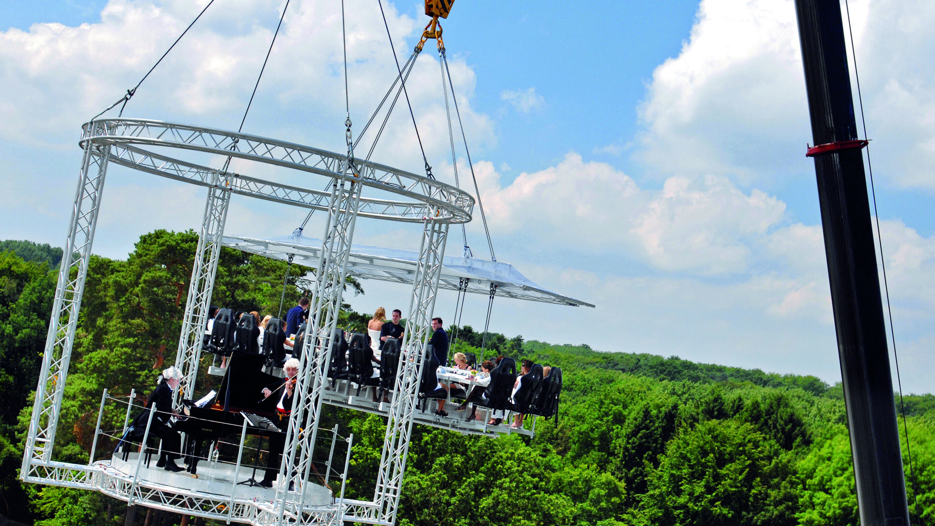 Een hijskraan, een rechthoekige tafel, een kok en maximaal 22 gasten. Dat zijn de ingrediënten voor een ‘Dinner in the Sky.’ Restaurantpersoneel serveert eten en drinken vanuit het midden van de tafel. Het concept is naar Nederland gehaald door Showbusiness Entertainment uit Almere. Dineren op grote hoogte kon al eerder in onder andere Dubai, Boedapest en Las Vegas.