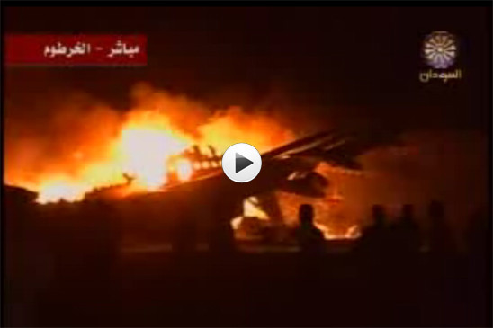 Gisteravond schoot een vliegtuig met ruim 200 inzittenden van de landingsbaan in de Sudanese hoofdstad Karthoum. Na de landing ontplofte bij het taxiën de rechtermotor. Het toestel vatte onmiddelijk vlam.