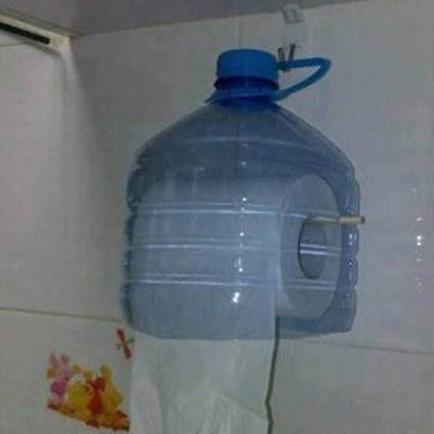Knip een verticale snee in een plastic blik of fles. Hier stop je een toiletrol in, waardoor je altijd met droog papier naar de wc kunt, ook al heeft je tas of tent gelekt de nacht ervoor.