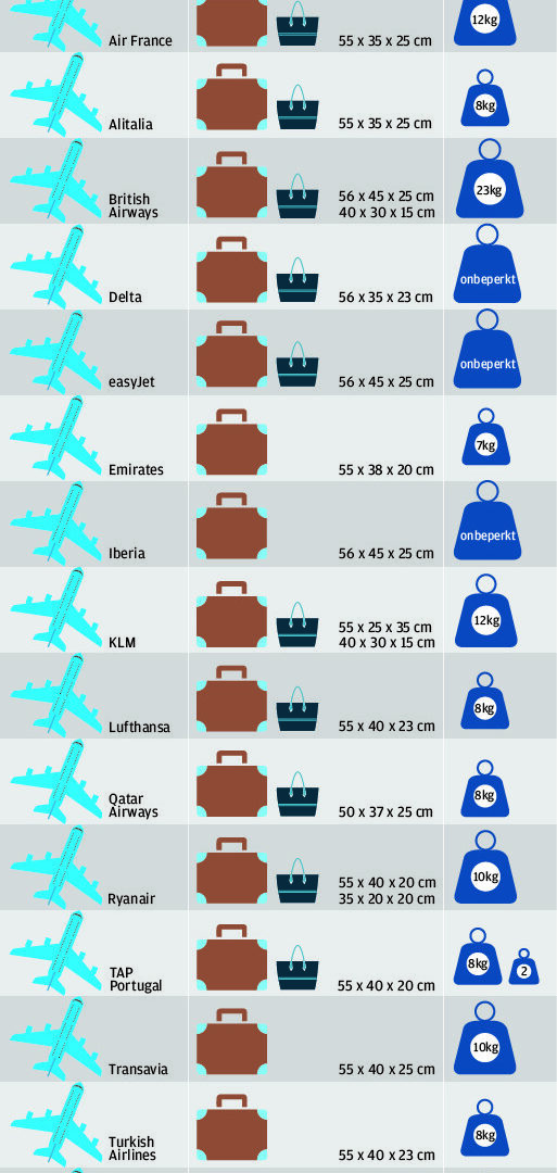 Aangezien het ontbreekt aan universele bagageregels, wordt het er voor de consument niet gemakkelijker op. Want mag je tas bij airline X nu wel meer dan tien kilo wegen of niet? En voldoet je koffertje bij airline X nu wel aan de toegestane afmetingen of niet? Om je op te weg te helpen stelden wij een handig overzichtje samen van de bagageregels per airline.