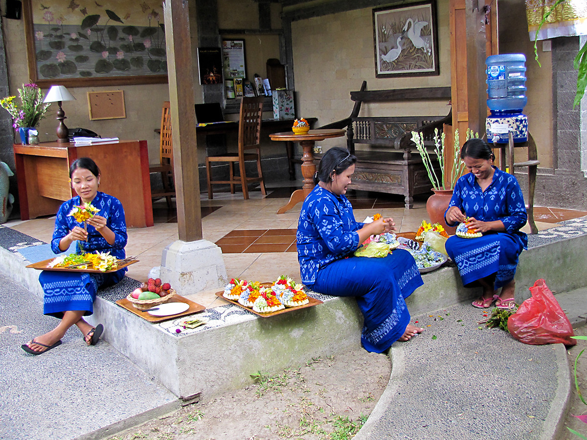Deze kamermeisjes houden zich bezig met bloemstukjes maken voor in de kamers (Foto: Reisreporter AdriaanV)