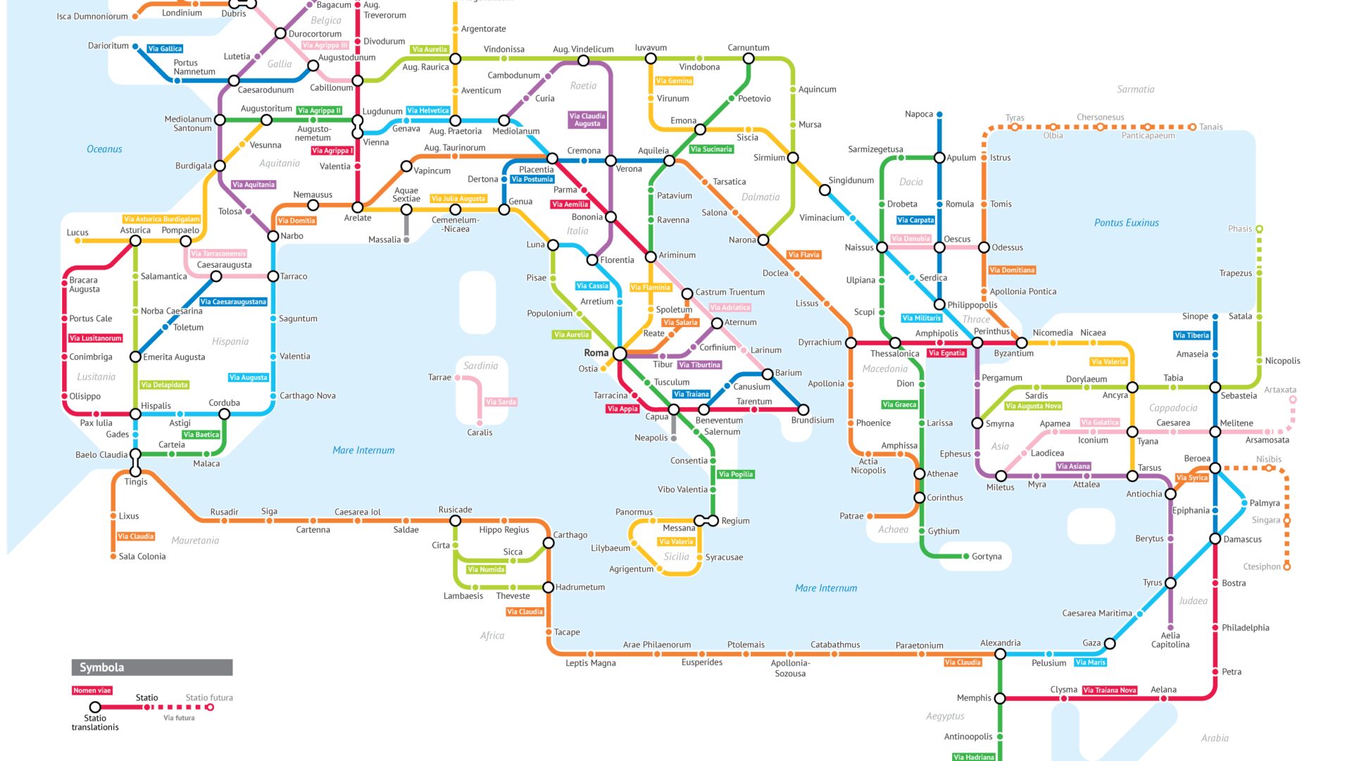 Dat de Romeinen, die hun rijk uitbreidden tot in Afrika, Azië en Midden-Nederland, donders goed wisten waar ze mee bezig waren blijkt wel uit het uitgebreide verharde wegennetwerk dat ze aanlegden. De wegen, zoals Via Latina, Via Flaminia, Via Salaria en Via Appia, waren van zulke goede kwaliteit dat delen ervan zelfs nu nog zichtbaar zijn. Deze belangrijke Romeinse routes vormen dan ook de basis voor de fictieve metrolijnen in onderstaande kaart.