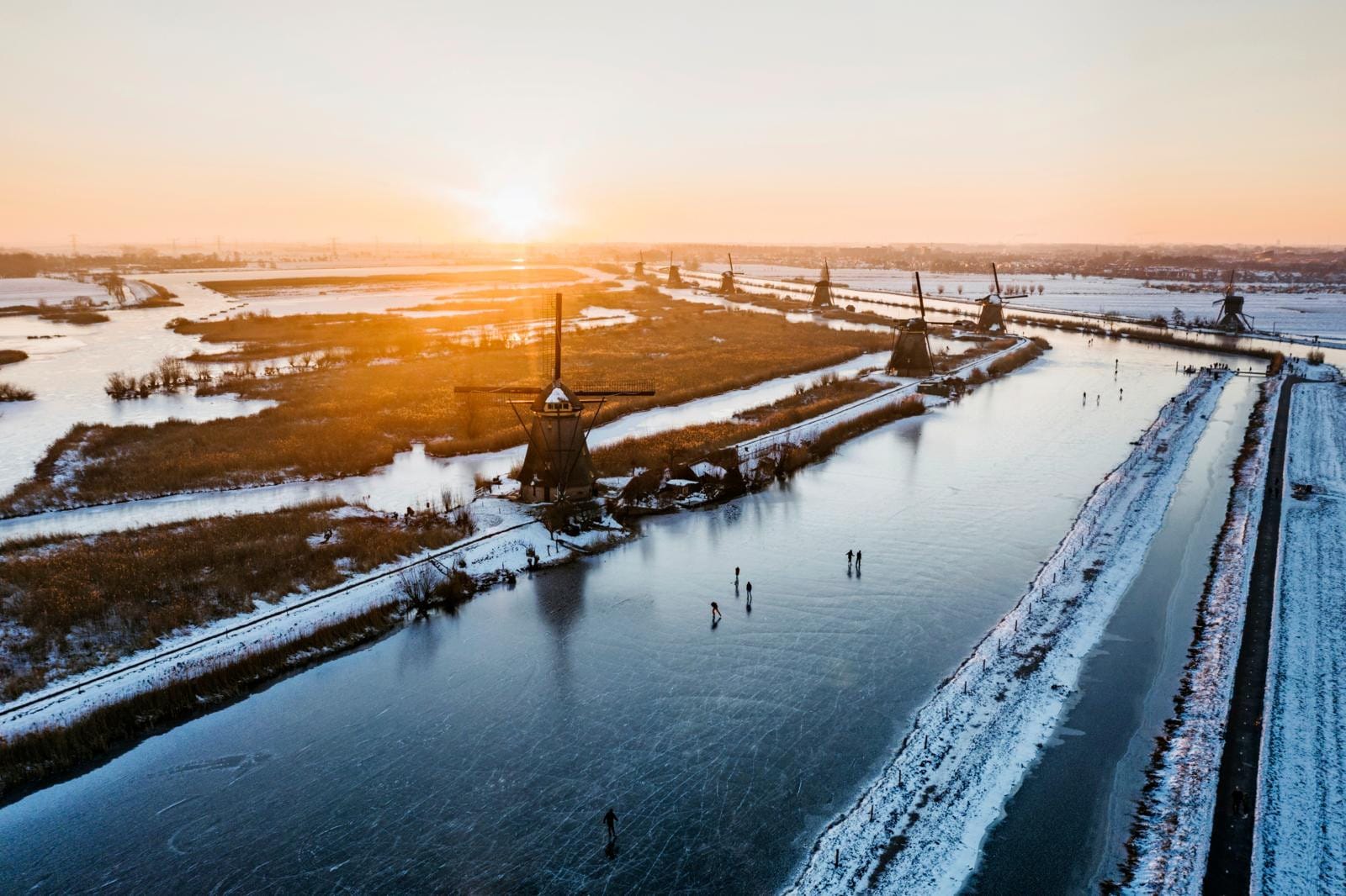 Schaatsen tijdens de winter langs de molens in Kinderdijk. Foto: Marleen Kuijpers