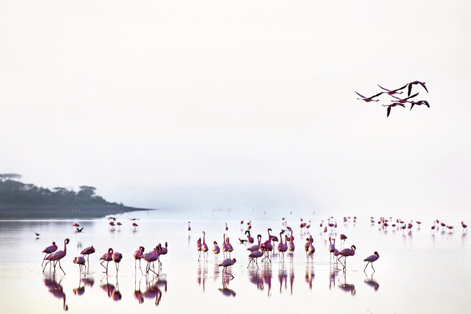 Duizenden flamingo’s aan de oevers van Lake Ndutu doen zich te goed aan de grote hoeveelheden plankton in het water.