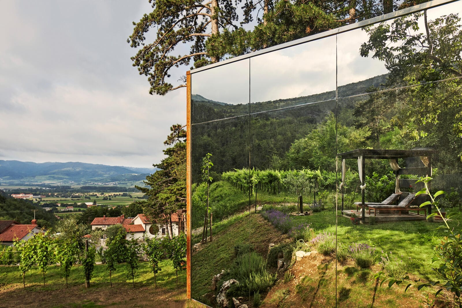 Verborgen in een eeuwenoud dennenbos met uitzicht op de Sloveense Vipavavallei liggen de glazen ‘nesten’ van Theodosius Forest Village, vanaf € 165 per nacht voor twee personen.