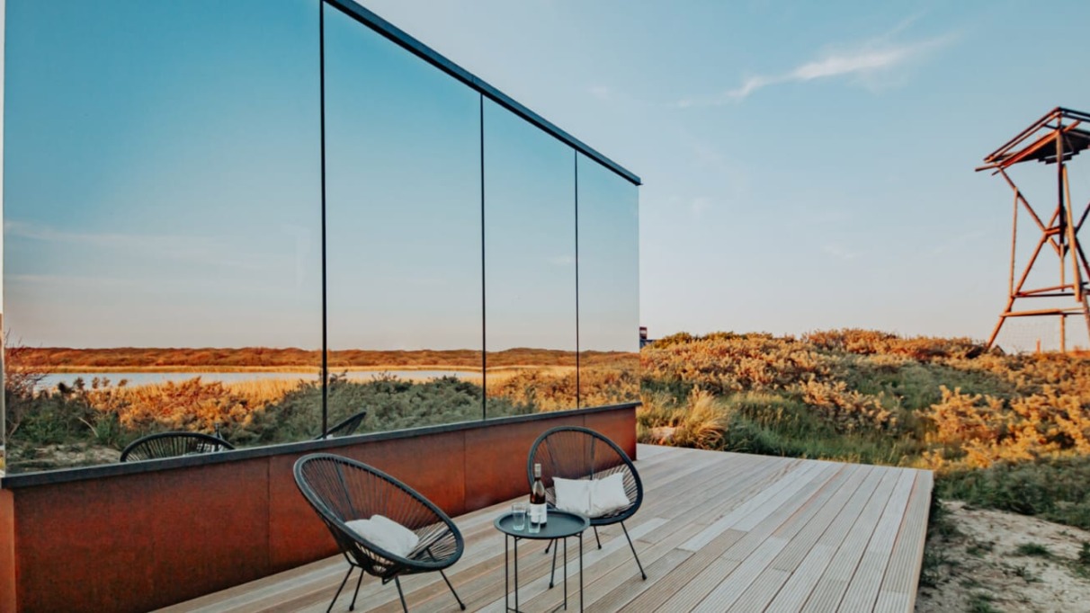 Wie zich terug wil trekken in zo’n spiegelpaleis, hoeft niet eens ver te reizen. Op het terrein van Basecamp, een ecoresort met 33 unieke tiny houses in de Hollandse duinen, staan twee panoramische ÖÖD Suites. Je boekt er een vanaf € 198 per nacht voor twee personen.