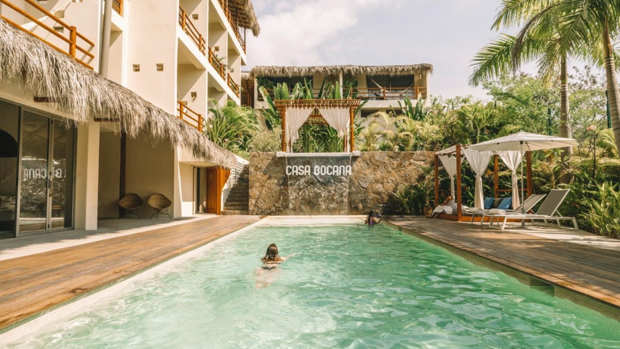 Een fijne slaapplek vinden in de baaien van Huatulco is nog best een klus. Het aanbod beperkt zich tot all-inclusive-resorts met de uitstraling van een interneringskamp in de baaien nabij Santa Cruz, enkele backpackers-hostels in surfersdorp Barra de la Cruz en een verzameling vakantiehuizen. Casa Bocana vormt de uitzondering: de Duitse eigenaar van dit duurzame designhotel aan het Bocana-strand wilde het graag ‘anders’ doen, met luxueuze kamers, een geweldig dakterras en een goed restaurant, op honderd meter van het strand. Vanaf € 184 per nacht.