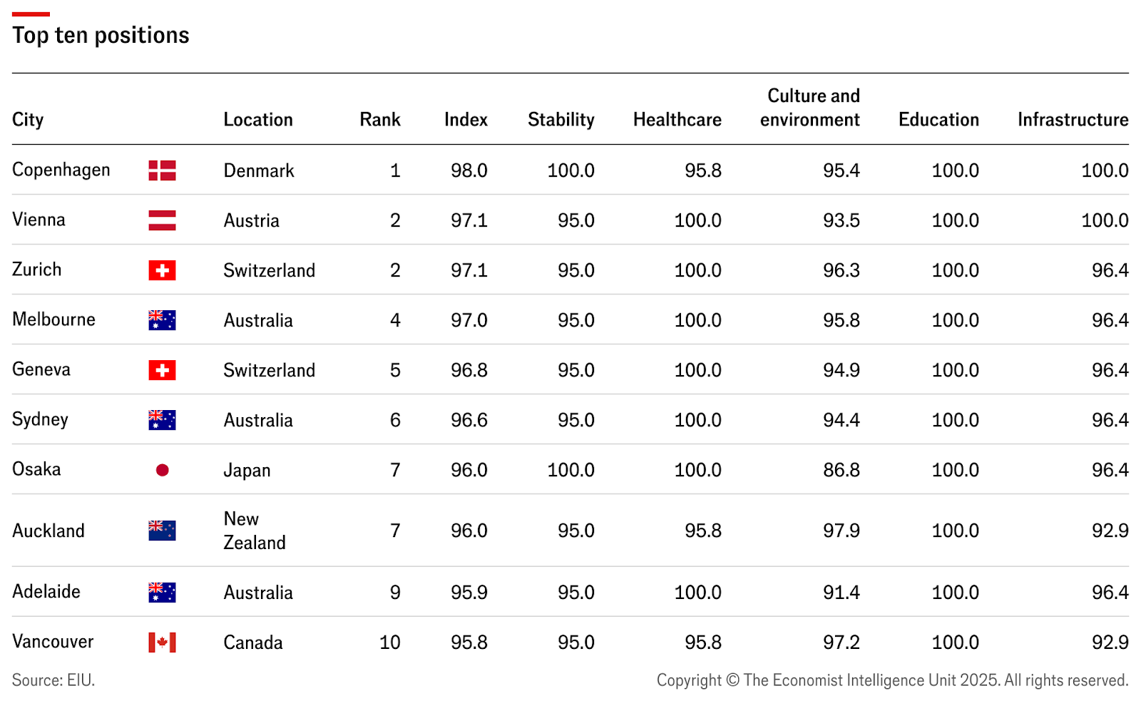In het onderzoek worden 173 steden wereldwijd beoordeeld op vijf pijlers: stabiliteit, gezondheidszorg, cultuur en milieu, onderwijs en infrastructuur. Kopenhagen scoorde dit jaar een perfecte 100 voor stabiliteit, onderwijs én infrastructuur en behaalde een totaalscore van 98,0.