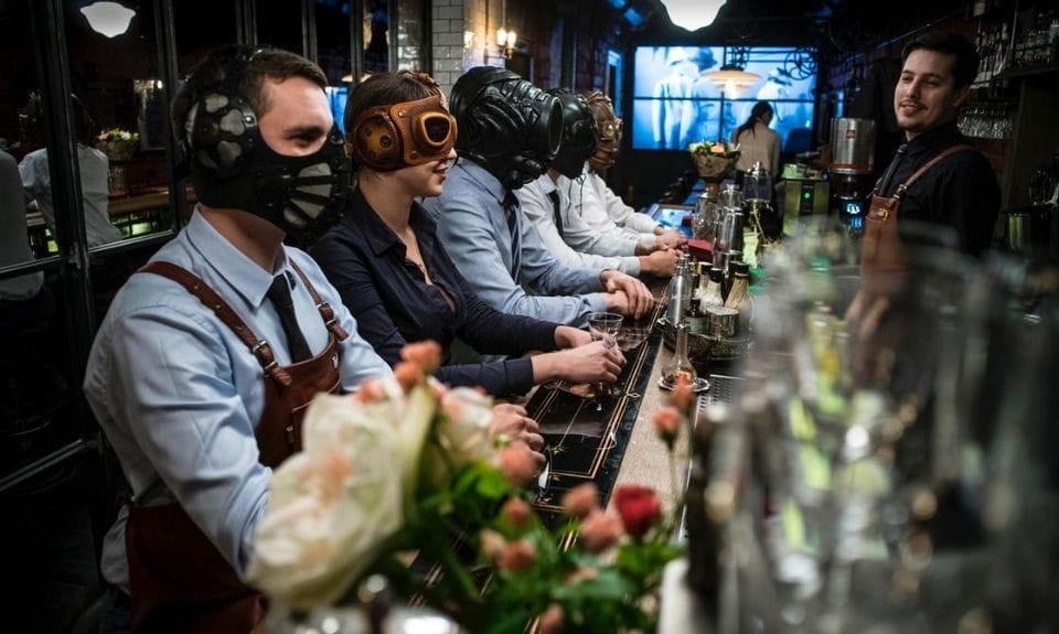 Speak Easy Parovoz is Oekraïens voor locomotief. Dat verklaart de langgerekte vorm van de bar. ‘Stoomelementen’ komen ook terug in de bekleding van zowel het interieur als het personeel, dat af en toe in bizarre retro (gas) maskers achter de bar verschijnt. Maar geen zorgen, het enige wat jij zal ruiken zijn de frisse cocktails. Een andere aandachttrekker is het grote televisiescherm waarop geregeld oude zwartwitfilms en historische documentaires worden vertoond − een knipoog naar de bioscoop die hier in de Sovjettijd zat. Om ongenode gasten buiten de deur te houden voeren speakeasies fantasievolle wachtwoorden in zoals ‘doodskistenvernis’, ‘apenrum’ en ‘vogelspinnensap’.