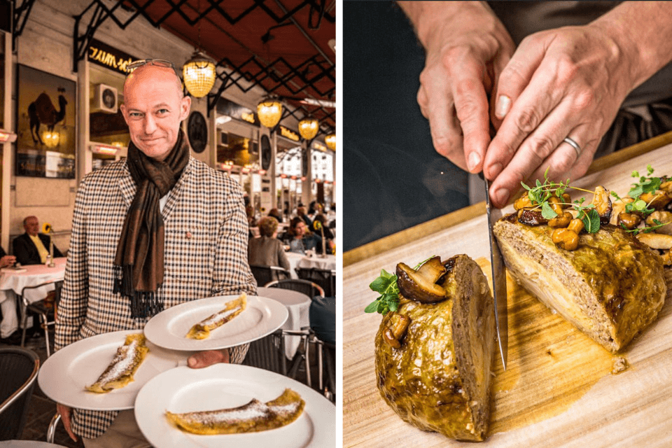 Links: Gastheer Pablo Meijer-Schomburg serveert Palatschinken, een crêpe-achtige pannenkoek, op het terras van Zum Schwarzen Kameel in Wenen.