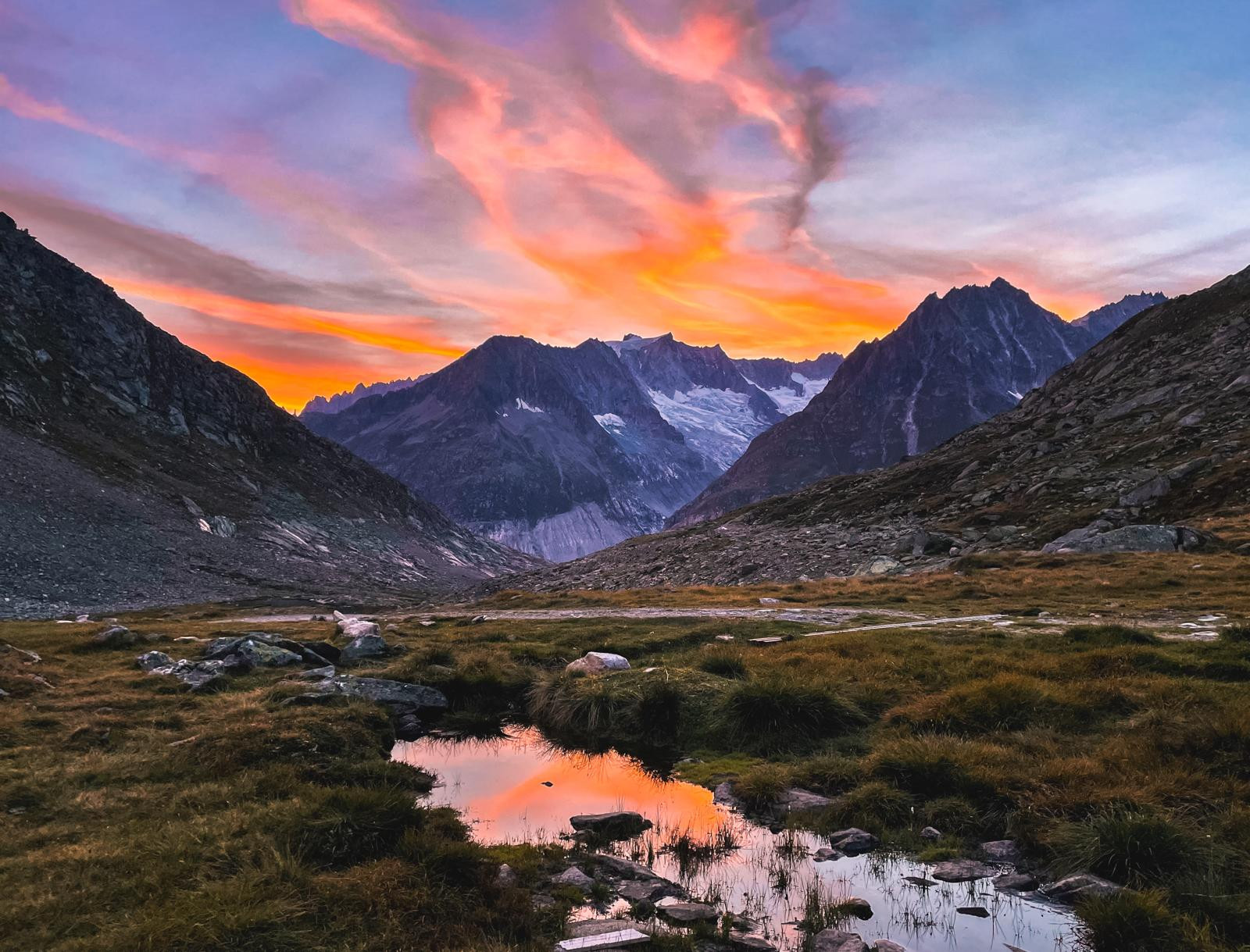 Djoy vertelt: ‘Deze foto is genomen tijdens de zonsondergang, vlak bij verblijf Gletscherstube Märjelen in Wallis, Zwitserland. Woorden kunnen het gelukzalige gevoel van dit moment niet omschrijven na een dag hiken. Allereerst hebben we deze dag de cable car van Betten Talstation naar Bettmeralp genomen. Vervolgens zijn we door het dorpje Bettmeralp gelopen en hebben we de cable car naar het uitzichtpunt Bettmerhorn genomen. Daarna begon de prachtige hike (zes kilometer / 2.5 uur / omhoog: 152 meter / omlaag: 439 meter) van Bettmerhorn naar Märjela. Iedereen kan dit! Prachtig uitzicht over de Aletschgletscher en nog veel meer moois. Om dan de dag af te sluiten met dit beeld, dat is veel meer dan een cadeautje! Voor de echte bikkels: de volgende dag door naar View Point Eggishorn.’ Volg Djoy op Instagram.