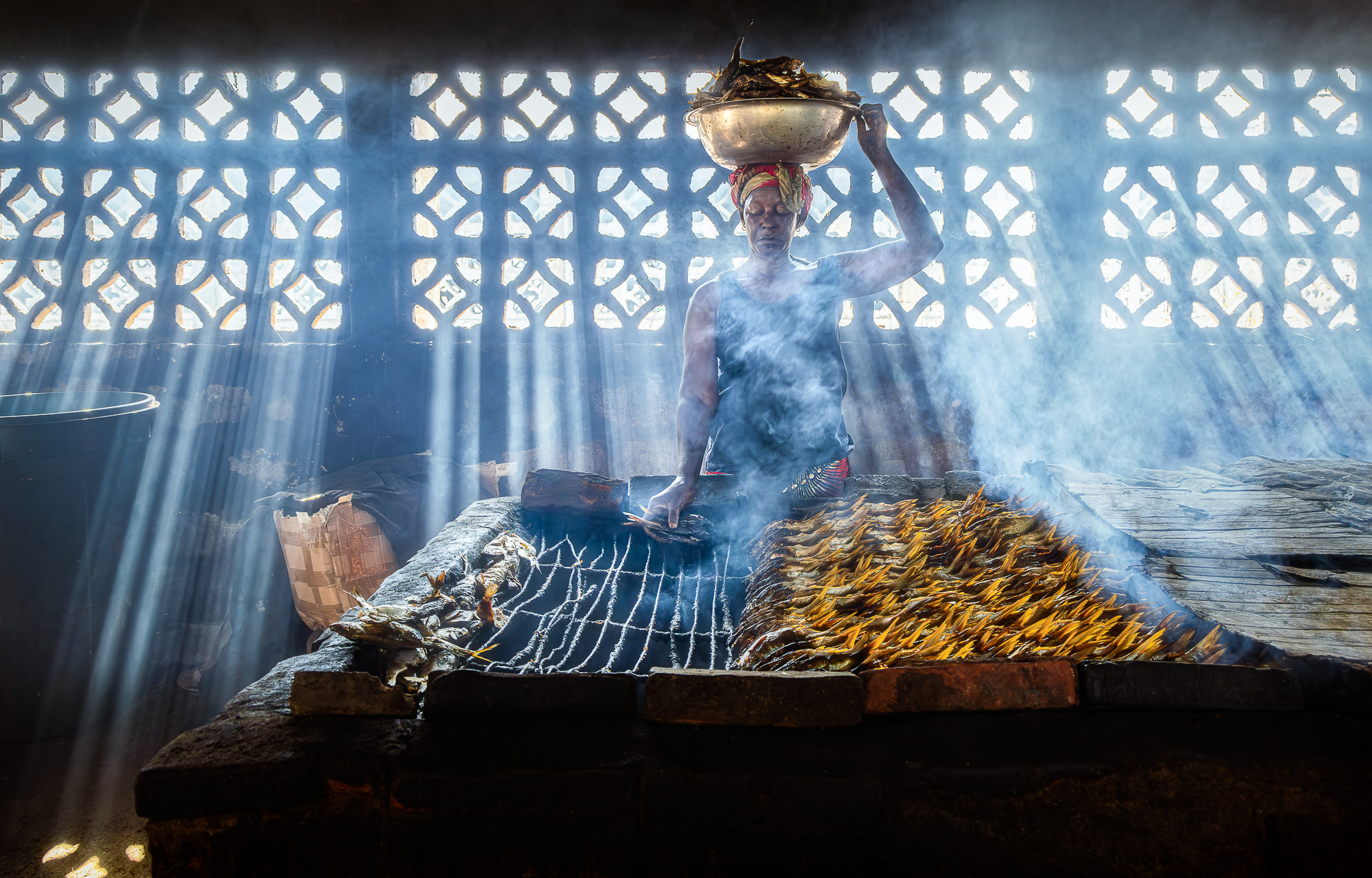 Juryoordeel: ‘Bij dit beeld riepen we ‘wow!’ in koor. Wat een schitterend mystieke plaat van een moment dat in dit land ongetwijfeld hartstikke alledaags is, maar bijna ritualistisch overkomt. De rook vermengt zich prachtig met het invallende zonlicht, waardoor dingen die je normaal niet zou betitelen als ‘mooi’ – de vissenstaarten, de kartonnen doos – perfect worden uitgelicht. Ondertussen werkt de vrouw onverstoorbaar voort. Dit is waarvoor we reizen. Gefeliciteerd met je prijs, Axel!’