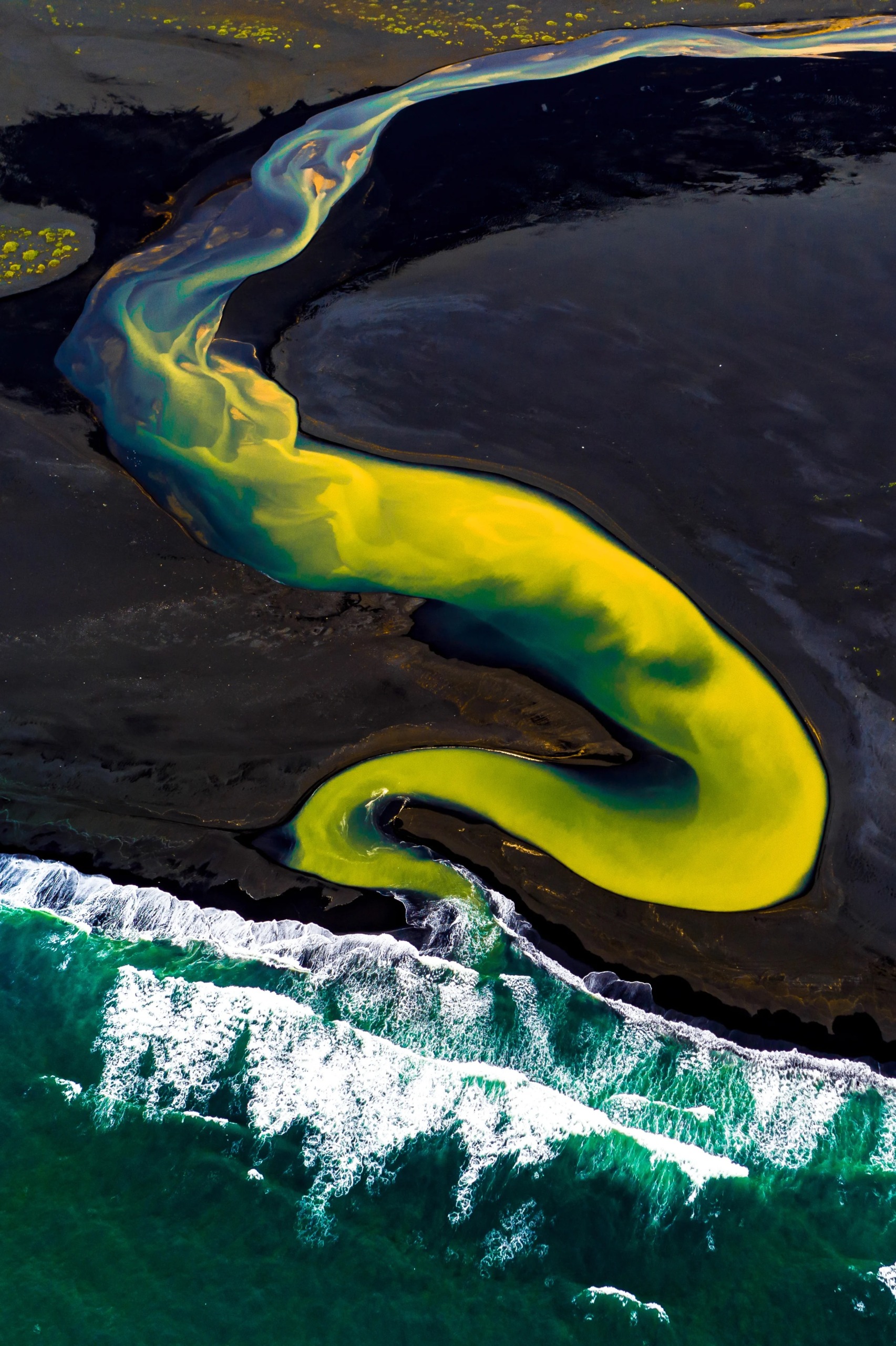 Op deze dronefoto ontvouwt zich een gletsjerrivier die haar weg zoekt naar de oceaan. Van bovenaf lijkt het water een schilderij: tinten groen, geel en roestbruin vloeien in elkaar over, gevormd door eeuwenoude sedimenten en mineralen. Het is alsof de aarde zelf hier met penseelstreken haar verhaal vertelt: rauw, puur en betoverend.’ Volg Erik op Instagram.